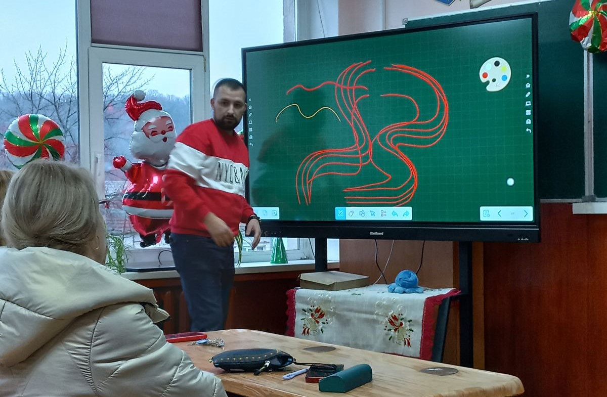 У межах навчання педагоги опанували роботу з інтерактивною дошкою в системі Android, зокрема запуск обладнання, базові налаштування та використання вбудованої цифрової дошки. Учасники ознайомилися з основним функціоналом: письмом і малюванням різними інструментами, зміною кольорів і товщини ліній, стиранням, додаванням тексту та використанням геометричних фігур. Окрему увагу було приділено переміщенню та масштабуванню об’єктів, а також практичним прикладам застосування дошки під час пояснення навчального матеріалу.